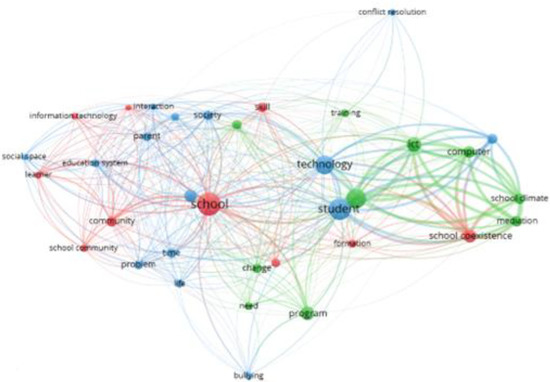 Cluster 3: shown in green, and this line focuses on the digital competence that teachers must have in order to apply ICT to improve the social climate and conflict resolution. Among the terms that appear are ICT, teacher, conflict resolution, school climate and mediation.