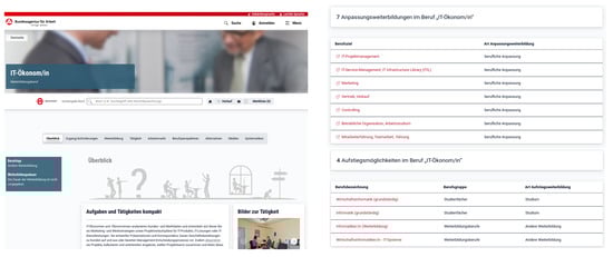 BERUFENET website for “IT-Economics (certified)”, see https://web.arbeitsagentur.de/berufenet/beruf/15323 (accessed on 2 December 2023). (Left) The landing page with an overview. (Right) Continuing education programs that provide links to KURSNET and can be crawled using the API.