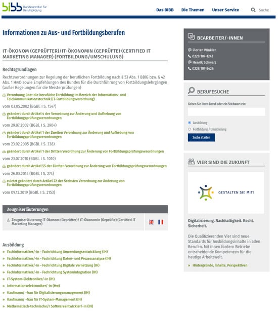 In the Federal Republic of Germany, the Vocational Training Act (BBiG) of 1969, which was reformed in 2005 and in 2020, was passed to create a political framework for shaping the work of vocational regulation [55]. If occupations are newly created or updated, several parties are involved: (a) the companies and chambers (employers), (b) the trade unions (employees), (c) the federal states, and (d) the federal government. Finally, the federal government provides the legal framework for vocational education and training through laws and regulations. The Federal Institute for Vocational Education and Training (BIBB), founded in 1970 on the basis of the Vocational Training Act (BBiG), provides the content of the training regulations online:
