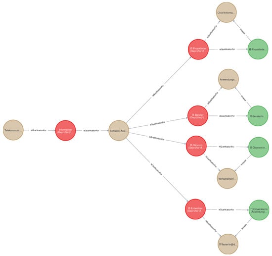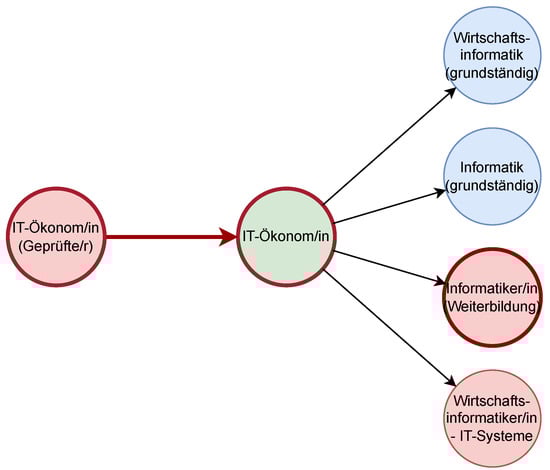 In Figure 4, we present some results for IT professions. For instance, according to the data from web resources of the BIBB, a “Telecommunications Electronics Technician” can use the CVET program “Computer Scientist (Certified)”, which leads to “Professions in Software Development—professionally oriented activities”, which in turn gives opportunities for the four additional CVET programs: (1) “IT Project Manager (Certified)”, leading to “Managers, IT Network Engineering, Coordination, Administration, Organization”; (2) “IT consultant (certified)”, leading to “professions in IT application consulting”; (3) “IT economist (certified)” (see also Figure 3), leading to “professions in IT sales”; and (4) “IT developer (certified)”, which finally leads to “occupations in IT coordination”.