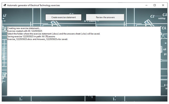 This section presents the development of the exercise generator designed for the didactic unit on the basic sizing of low-voltage electrical installations, where the calculation of short circuits in different parts of the installation was carried out in order to be able to subsequently choose the appropriate protections. Using this program, the students themselves could generate any exercise from this syllabus. Each exercise was unique and was aimed at improving students’ skills when solving these types of exercises. The interface of the exercise generator was designed to be used by any user, be it an instructor or a student. Therefore, it had a minimalist structure and consisted of only two buttons and a terminal box where various messages were displayed, as shown in Figure 4. Students could not modify the configuration of the generator through the interface. The only way to configure the parameters of this program was to access the configuration files inside the installation folder, where only authorized users had access.