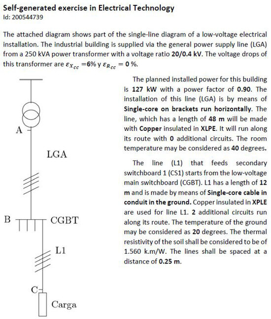 As Figure 5 shows, the statement of the exercise presented a low-voltage installation, setting its single-line diagram and the parameters of this installation from the power transformer to the main connection, its internal branches, and the loads coupled to this installation. It was requested to solve the sizing of the conductors of this installation while calculating the short-circuit currents to subsequently select the appropriate protections. The variability of the exercise lies in the variation of the proposed installation and its parameters, while the resolution of the exercise requested did not vary (sizing and protections).
