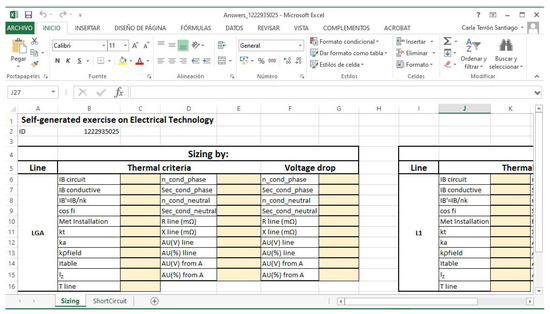 The answer spreadsheet included two tabs. The first tab corresponded to the solutions for the calculation of the sizing of the installation regarding all its wires (the general supply line, line 1, etc.), while the second tab corresponded to the solutions for the calculation of overcurrents. Both the text document and the spreadsheet displayed the identifier of the exercise they belonged to so that students could identify which exercise statement corresponds to each solution entered in the spreadsheet.