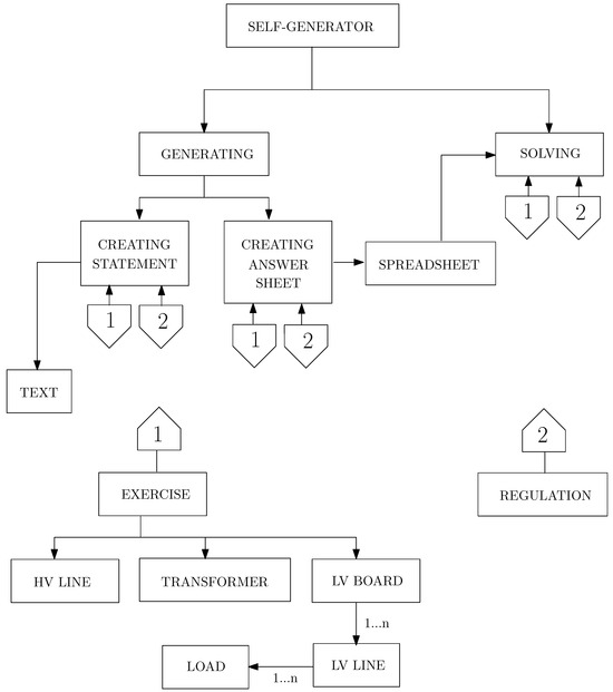 Considering the kind of exercises we self-generated, e.g., an installation with several boards, lines and loads, which can be divided into sub-exercises, an object-oriented programming philosophy was proposed. The program was implemented in the Visual Studio 2019 development environment. This development environment has libraries that allowed us to fully manage the generation and editing of text and spreadsheet files. Both file types were fully familiar to our engineering students. The main objectives of the program were the following, which have been summarized in Figure 7: