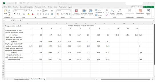 This type of exercise, where a low-voltage installation is developed, are regulated by the Low-Voltage Technical Regulation, among other standards. Both for the generation of exercises and for their resolution, it is necessary to consider this and other standards. For this reason, all the relevant parameters of the regulations were codified in a spreadsheet to be used by the self-generator program both for generating and solving exercises, as in Figure 8. In the case of changes to the values indicated in the regulation, it would only be necessary to update this spreadsheet file, and the self-generator program would consider the new regulations.