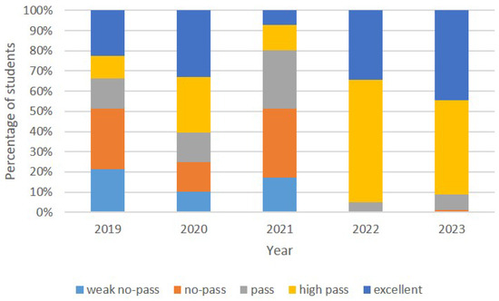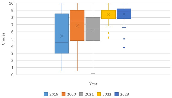 This change in motivation becomes apparent when examining the results over the years. It was noted that, with the traditional methodology, student performance gradually declined. Students’ understanding and assimilation of concepts deteriorated and was particularly exacerbated by the impact of the COVID-19 pandemic, during which students may have adapted to alternative modes of learning. This trend was also reflected in the progression of grades, as shown in Table 4, where it is evident that in 2021, 50% of enrolled students did not pass the course. With the change of the methodology used to a more active approach, students became much more involved in their learning process.