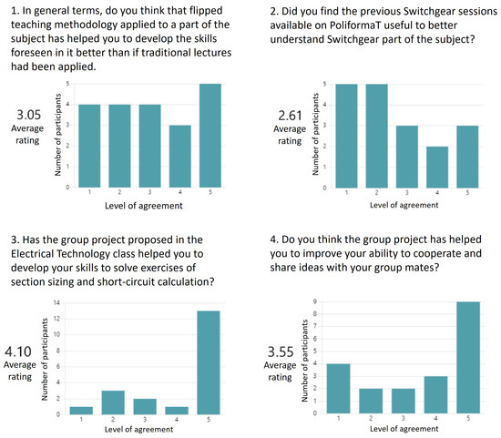 The previous section has shown that the change in the methodology lead to an improvement in the evolution of the students outcomes. However, it is also important to know the opinion of the students in order to conduct a broader analysis and to be aware of whether they perceive this change in methodology in a positive way. It is also important to know how they perceive their learning process and the development of their own self-learning skills. For this purpose, a very concise form was distributed with the help of Google Forms among the students of one class of the academic year 2022/2023 that had been subjects of the methodology change. The survey included only four questions: how deeply had the new methodology affected the students’ attainment of the subject’s specific and transverse student outcomes and how they felt about the FT sessions developed. This was carried out with the aim of obtaining the maximum number of participants in the survey. The length of a survey is inversely related to the likelihood that students will complete it; the longer the survey, the lower the willingness to participate. Since students responded to the survey after they had completed the course and received their final grades, this avoided possible bias or apprehension if the comments were not favorable. Moreover, considering students are usually busy with other activities, our concise survey aimed to maximize response rates.