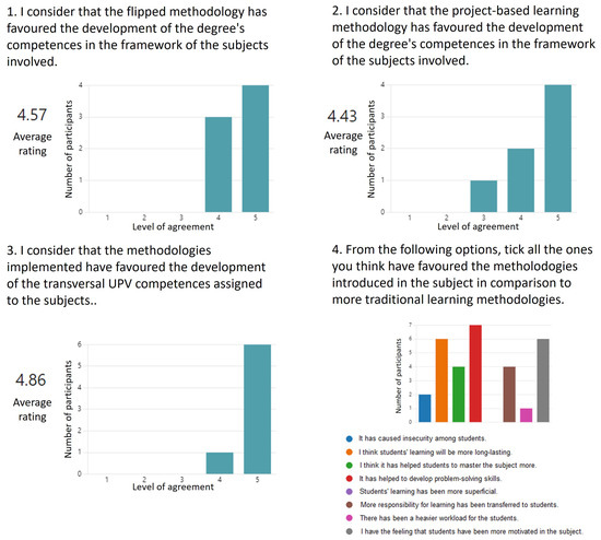 Along with the students’ perception, it was also considered necessary to understand the perception and thoughts of the subject professors in order to make an overall assessment of the change in methodology. Several follow-up meetings were held with the staff who taught the subject. The most significant conclusions were that the students had shown a high degree of involvement in the development of their projects. It was observed that the change in the methodology favored the acquisition of competences by the students. However, it was found that students were not as involved with the FT sessions as they were with their projects. This second aspect was discussed with students, from which we concluded that these activities were only carried out by students who attended class regularly; in addition, they pointed out that, due to their high teaching load, it is challenging for them to combine all activities.