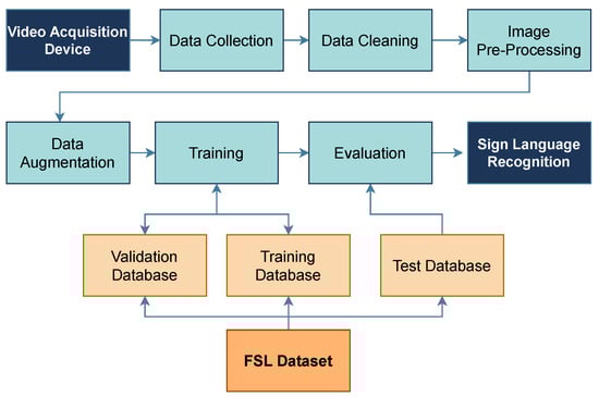 This study utilizes a video-based sign language recognition system, as shown in Figure 1. The architecture [16] involves several processes that are individually explained in the following section, including the specific techniques to be used for each process. Moreover, the system utilizes two databases: one for training the algorithm and the other for the dataset of the FSL hand signs, which serves as a benchmark for determining the expected output.