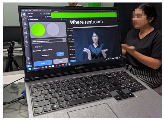 As part of the data collection procedure, the signers performed the gestures under controlled conditions, as shown in Figure 2. This ensured that the key upper body parts, including arms, head, shoulders, and chest, were precisely within a designated central area. This area was facilitated by a bounding box centered around the captured image, measuring 1156 × 866 pixels, precisely customized to meet the aforementioned conditions. By imposing such spatial restrictions, unwanted regions were effectively excluded, thereby enhancing the integrity of the dataset.