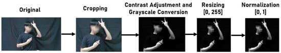 Following the frames’ removal, the resulting input image stream sequentially underwent classical image pre-processing stages, including cropping, contrast adjustment, grayscale conversion, resizing, and normalization, as presented in Figure 3. The bounding box established during data collection served as the basis for cropping the images, extracting only the region of interest for the subsequent processes. Afterwards, gamma correction was applied to enhance the contrast, followed by grayscale conversion to simplify computations. The image stream was then resized to 128 × 128 pixels, further reducing computational burden during both training and inference. This resizing ensured uniformity in input size for the deep learning model. Finally, the resized image stream underwent normalization, ensuring that all input frames had a comparable pixel distribution. This normalization step accelerated convergence during training by scaling the pixel values from the original integer range to the normalized float range [31].