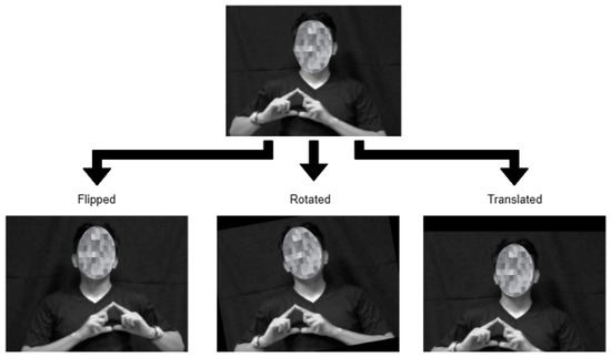 Accordingly, a random translation moves the frame along the x-axis by between −40 and 40 pixels and along the y-axis by between −35 and 35 pixels. Only horizontal orientation was carried out for random flipping. The random rotation ranged from −10° to 10°. With augmentation, the FSL dataset increased from 1050 recordings to 21,000 after augmentation, with 1400 samples for each class.