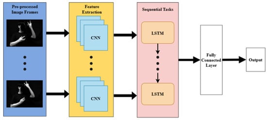 Convolutional Neural Networks (CNNs) and Long Short-Term Memory (LSTM) Recurrent Neural Networks are two cutting-edge deep learning models [32,33,34,35,36], which we combined to create the proposed model, as shown in Figure 5. CNN is in charge of extracting distinguishing or distinctive features from an input image [16]. In the CNN-LSTM framework, CNN takes a sequence of input images , where represents the image frame at time step t with height H, width W, and C channels. The feature map extraction operates by running a convolutional filter on an input image [37], as expressed in Equation (1):