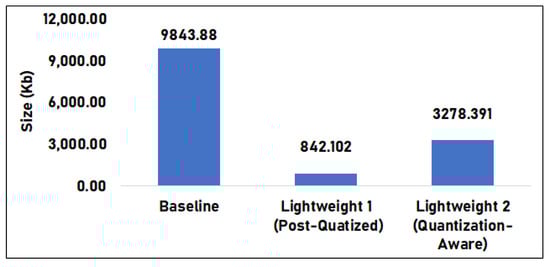 A lightweight model was developed that was optimized to be used with low-processing power-enabled devices such as mobile phones. This work employed the Quantization method in the new model, a technique in which the weights and inputs are searched for optimal low-bit intervals. This results in an insignificant reduction in precision in the weights and inputs by making floating-point operations into integer operations [38,39], but which speeds up inferences and reduces memory utilization. There are two quantization methods. The Post-Quantization method is where the quantization application is done after extraction and training of data. The usage of dynamic range post-quantization is a good starting point, as it reduces memory utilization and speeds up calculations without requiring a representative dataset for calibration [40]. Quantization-aware training, on the other hand, involves continuous weight adjustments as it learns in order to better fit the quantization operations [39]. This training is designed to have a low error in quantized models, as it involves numerical errors being exposed and simulating them to a forward pass [41].