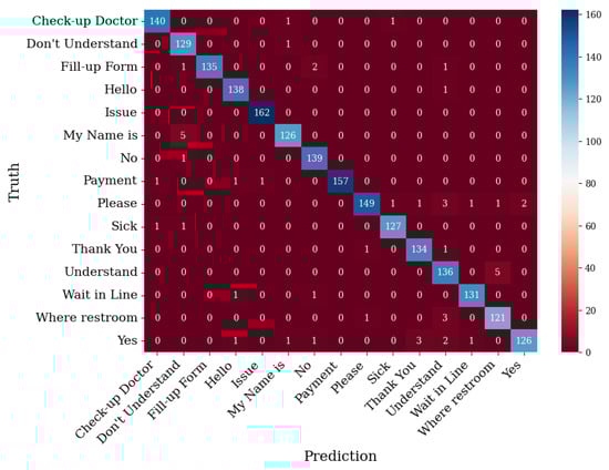 Table 5 summarizes the precision, recall, F1-score, and support values for each gesture and their respective accuracy levels, macro-averages, and weighted averages. Support is defined as the number of ground truth occurrences of each class. The macro-averages were calculated by averaging the unweighted mean per label and the weighted averages by averaging the support-weighted mean per label. Based on the table, most of the values of the F1-score were around 0.98 to 1.00, implying that the two gestures have near-perfect precision and recall, implying that the model overall has a high classification rate of distinguishing between gestures.
