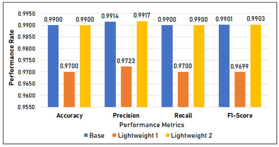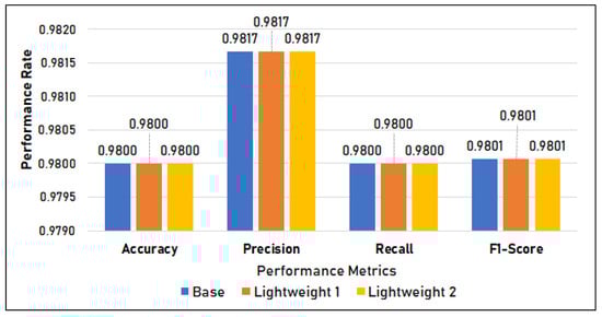 Figure 12 shows the classification metrics of the three models. It shows that there is a difference in the Post-Quantized (PQ) model’s (lightweight model classification metrics, with the models having an accuracy, precision, recall, and F1-score of 97%. On the other hand, both the base model and the lightweight model 2 scored 99%.