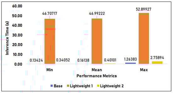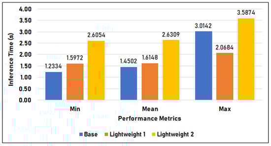 Figure 14 compares the time duration of the base model, lightweight model 1, and lightweight model 2 in Setup 2, or the Raspberry Pi setup. The base model has an average of 1.450 s inference time, a minimum time of 1.233 s, and a maximum of 3.014 s. Lightweight model 1 has an inference time of 1.615 s on average, 1.597 s minimum, and 2.068 s maximum. Lastly, lightweight model 2 has a 2.631 s mean, 2.605 s minimum, and 3.587 s maximum inference time. In this setup, the base model has the fastest minimum and mean inference but has the second-highest maximum time. In contrast, lightweight 1 (LW 1) has the lowest maximum inference time of 2.068 s and follows the base model in terms of minimum and mean inference times of 1.597 s and 1.615 s, respectively. Furthermore, lightweight 2 (LW2) has the slowest overall inference time in this setup, with 2.631 s mean, 2.605 s minimum, and 3.587 s maximum.