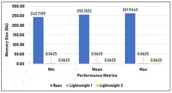 Figure 16 compares the memory utilization per inference of the base model, lightweight model 1, and lightweight model 2 in Setup 2, measured in kilobytes. Similar to the previous results in Setup 1, the base model used the largest amount of memory, with 7.546 KB minimum usage and 25.141 KB average, which is 9.15% smaller than in Setup 1, and a maximum utilization that spiked to 1745.840 KB. The memory utilization of the two lightweight models is 0.063 KB across minimum, mean, and maximum, which is consistent with the results of Setup 1.