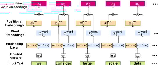 Here, d is the intended embedding dimensionality, and n in the denominator is used to manage frequencies across the dimensions of the embeddings. By using a large value such as 10,000 for n, the frequency spectrum is spread to ensure that the embeddings can capture patterns that occur over different sequence lengths. The outputs of the two embeddings are summed to obtain an output vector. This creates a word embedding enriched with position information (Equation (5)).