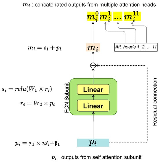 The outputs calculated by attention mechanism are added to the outputs from the encoder block to obtain , vectors that are used in the subsequent layer normalization step (Equation (14)).