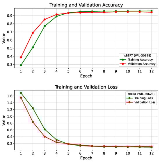 sBERT employs layer normalization to improve model performance by stabilizing training, reducing sensitivity to initialization, improving generalization, and facilitating faster convergence, thereby reducing the training time [43]. We first calculate , the mean, and , the variance of each input word vector , as shown in Equations (15) and (16).