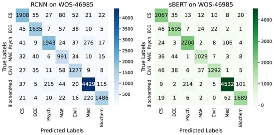 Table 10 lists the classification accuracy percentage measurements across the Nature, Springer, ArXiv, Wiley, and CornellArXiv datasets. Figure 10 shows confusion matrices for sBERT and RCNN on the WOS-46985 dataset. Figure 11 presents the results graphically.