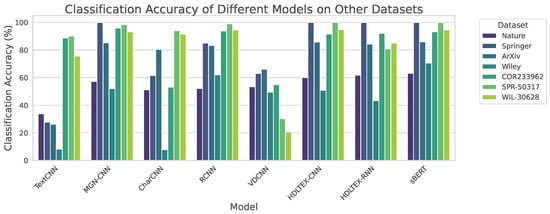 The Character-level CNN (CharCNN) exhibits moderate performance, with its highest accuracy observed on the ArXiv dataset at 80.53%. However, it faces challenges in the Wiley dataset, where it attains an accuracy of 7.82%. These results may be attributed to CharCNN’s reliance on character-level information, which may be less relevant or informative in certain datasets.