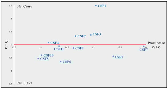 These results facilitate the development of a prominence and net effect diagram. This visual representation plots the combined prominence on the x-axis against the net effect on the y-axis, allowing for the differentiation between CSFs that are primarily causes and those that are primarily effects. Such a graphical depiction is essential for decision-makers, as it highlights the most impactful CSFs and clarifies their roles, thereby enhancing the strategic management of their interactions within the network.