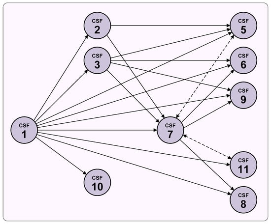 In the final stage of DEMATEL, the most crucial causal relationships between CSFs are graphically depicted. This involves illustrating these relationships using directed arrows based on the data extracted from the total relation matrix. To ensure that only the most significant relationships are highlighted, a threshold, denoted as , is defined. The value of is determined using the formula , where μ is the mean and is the standard deviation of the entries in the total relation matrix. This methodical approach, supported by studies such as those by Moktadir et al. [78], Huang et al. [85], and Kouhizadeh et al. [77], facilitates a focused representation. Interactions within the matrix that exceed this threshold are considered significant and are depicted with arrows in the diagram of key causal relationships. This selective representation strategy highlights only the most influential interactions, thus preventing less critical effects from obscuring strategic decision-making processes.
