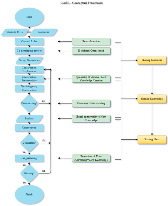 The main purpose of this research was to create a methodology that is directly oriented to the cultivation of collaboration skills. The CORE methodology (collaboration-oriented robotics education) offers a structured student-centered approach to robotics education. It emphasizes group work and a project-based approach, while minimizing rigid traditional, instructional methods. Additionally, it attempts to interconnect the different types of knowledge within ER to different collaboration skill outcomes. This specific element was highlighted within the extensive work of Jung and Won [16] as a critical factor in designing dedicated educational methodologies that shift the focus from technology to rigorous pedagogical gains for students [17].