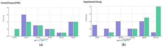Based on the descriptive statistics and frequency distributions (see Table 2 and Figure 4), distinct patterns emerged in the comparative analysis of the control and experimental groups’ performance. The control group maintained relatively stable metrics, with small variation between the pre-test (M = 85.88, SD = 6.54, Mdn = 83.00) and post-test values (M = 85.13, SD = 7.45, Mdn = 83.00). The frequency distribution for this group remained unchanged, with a slight increase in score variation as evidenced by the marginally higher standard deviation and the expanded range in the post-test scores (range = 22.00).