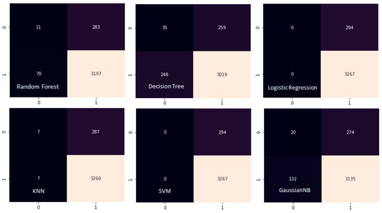 Figure 7 presents confusion matrices for all six ML algorithms. The colour intensity represents the number of predictions, with darker shades indicating higher values. True labels are shown on the y-axis and predicted labels on the x-axis. The matrices reveal consistent performance patterns and highlight the absence of false negatives in top-performing models.