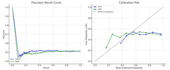 To evaluate model reliability in imbalanced classification settings, we plotted precision–recall (PR) curves and calibration plots for the top-performing classifiers (SVM and KNN). Figure 8 shows both models demonstrating high precision across all recall thresholds, with well-calibrated probability scores indicating low overconfidence in predictions. The curves confirm robustness in admission scenarios with class distribution biases.