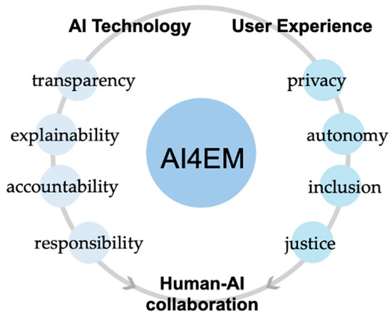 A synthesis of previous research has led to the proposal of the “AI4EM” framework (see Figure 1), with the objective of promoting the more effective application of AI technologies in emergency management scenarios. Within this framework, user experience is considered to be as important as AI technology itself. We advocate a dual approach to ethical and moral dilemmas, with solutions being sought not only at the technological level, but also with a focus on the user experience and the needs of the user. These needs include privacy, autonomy, inclusiveness, fairness, and justice. The optimization of the user experience is achieved through relevant design. The overarching objective of this framework is to facilitate a harmonious coexistence between technology and humans, thereby establishing a collaborative relationship between humans and AI. The ultimate aim is to achieve ethical and humanized emergency management.