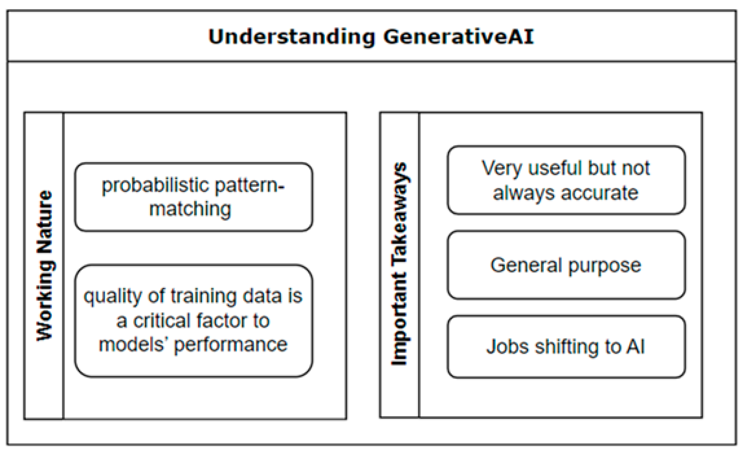 A solid understanding of generative AI’s working mechanism lays the foundation for successful incorporation. Because generative AI provides an unprecedented capability to human beings, understanding its working nature can greatly reduce the chance of misuse. Further, this paper discusses the new normal of cognitive automation, a concept introduced by Baily et al. (2023) [6]. Knowledge workers need to be ready to work in this new normal, in which machines undertake cognitive tasks, which used to be a unique ability of human beings. An important takeaway is that generative AI’s output may not always be accurate, but it is most likely useful. The terms general-purpose or general AI and generative AI summarize the new features brought by generative AI tools. General implies that it is not confined to a specific field. Any work having a language component in it can use some help from this type of tool. Generative implies that it generates/crafts responses for a prompt. This is an unprecedented capability that will drive deep changes in knowledge work. The term “language” in this paper has an extended scope that can refer to any form of human language, including pictures, voices, and videos.