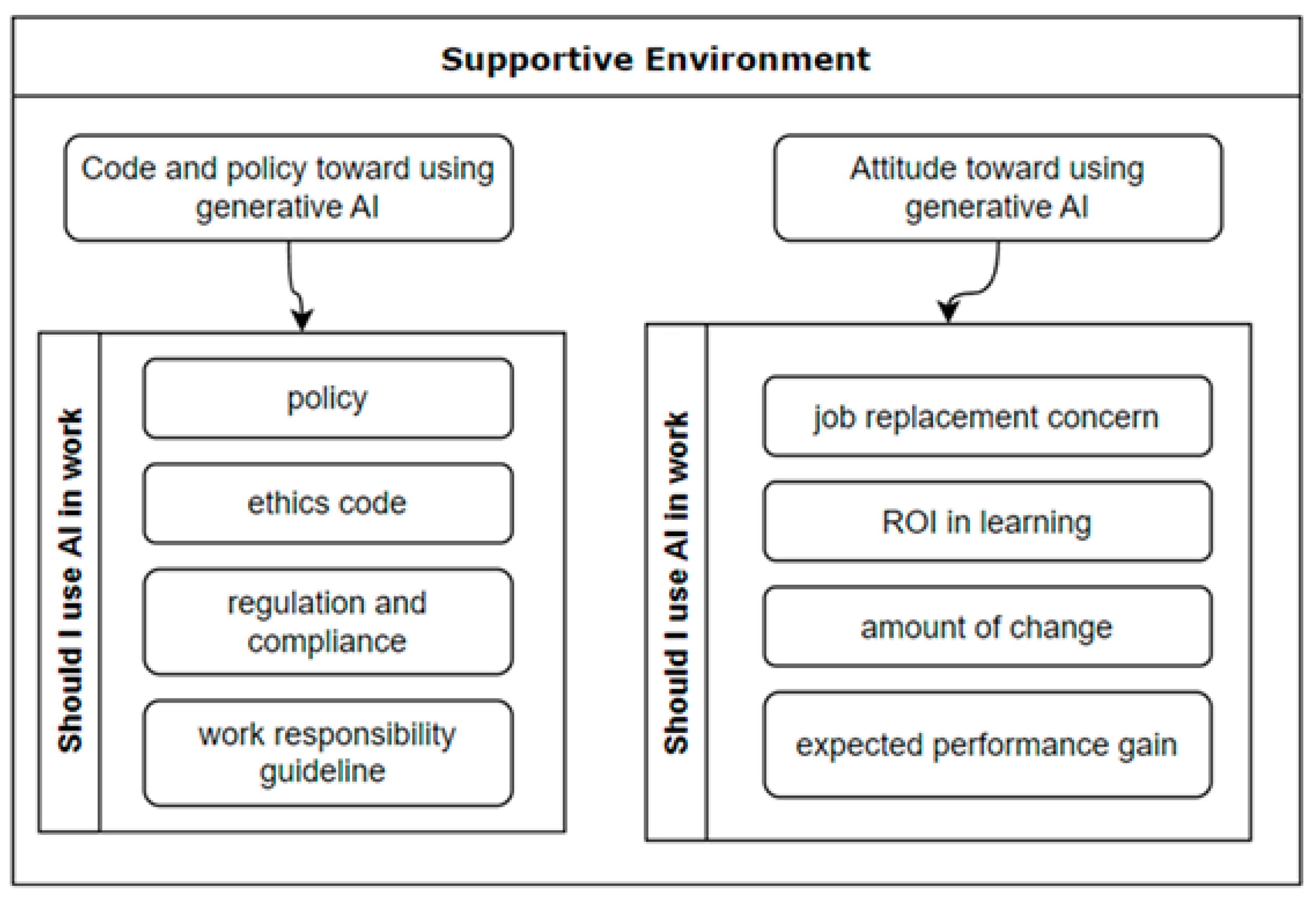 Generative AI is in its early stages, where most people have not fully understood it. A company’s general policies provide the initial guidance to workers. A clear policy can signal the management’s support for using generative AI in work. Generative AI Policy can use the blacklist approach, which allows everything except the known bad ones. This approach allows improvisation and tends to foster innovations [34,35]. Other regulatory means, such as codes of conduct, regulations, compliance, and guidelines, can use the same approach in order to foster a supportive environment.