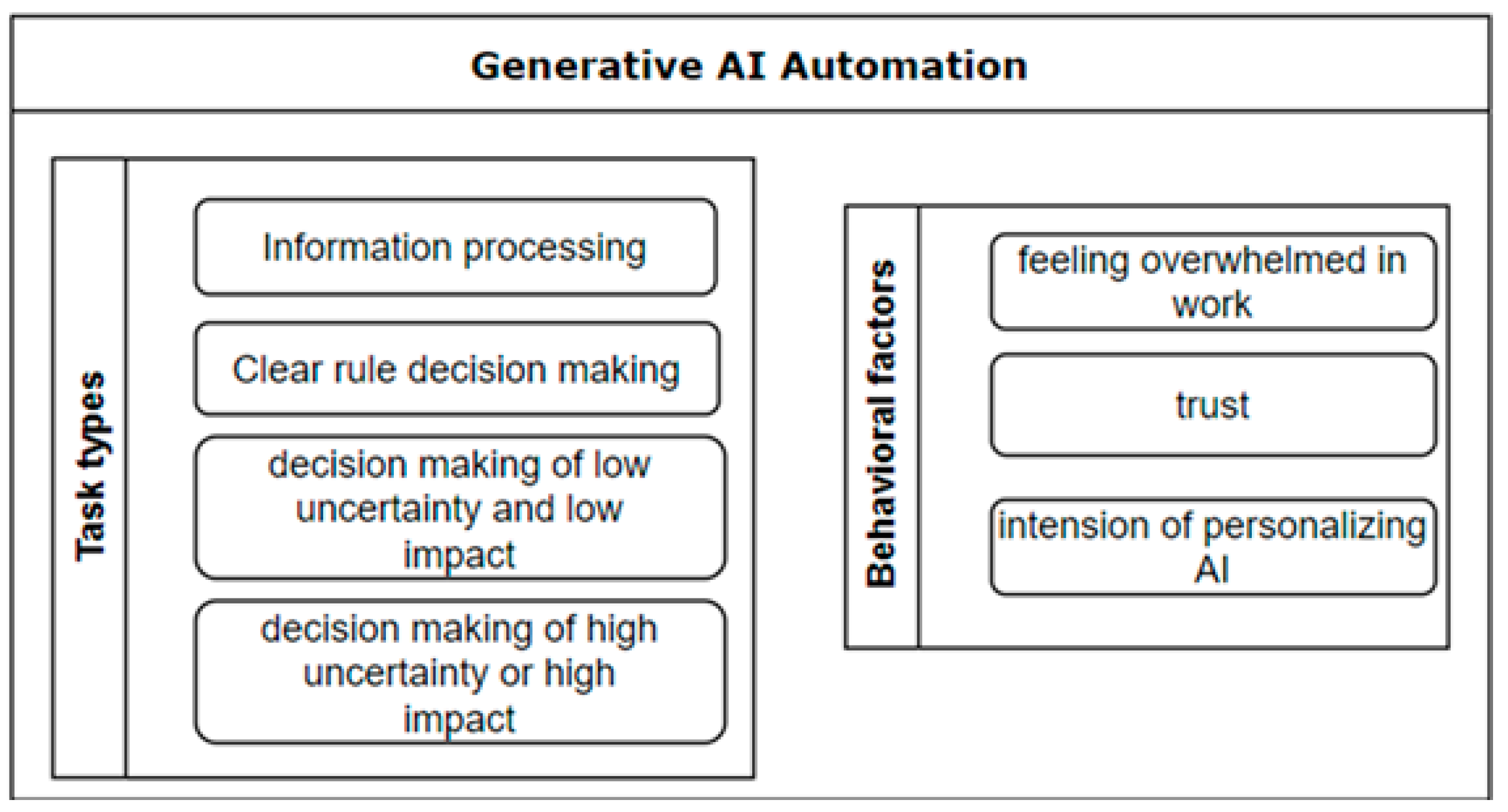 There are some behavioral factors that can influence people’s willingness to use generative AI to automate knowledge work. A poll from the National Alliance on Mental Illness https://www.nami.org/support-education/publications-reports/survey-reports/the-2024-nami-workplace-mental-health-poll (accessed on 15 January 2025) shows that 52% of employees reported feeling burned out in the year 2023 because of their job, and 37% reported feeling overwhelmed at work. According to [6,33], when feeling overwhelmed, people tend to use AI to automate tasks even knowing that humans make better decisions. Considering the large proportion of workers who felt stressed and overwhelmed at work, this factor has a big influence on the decision to automate tasks with generative AI.