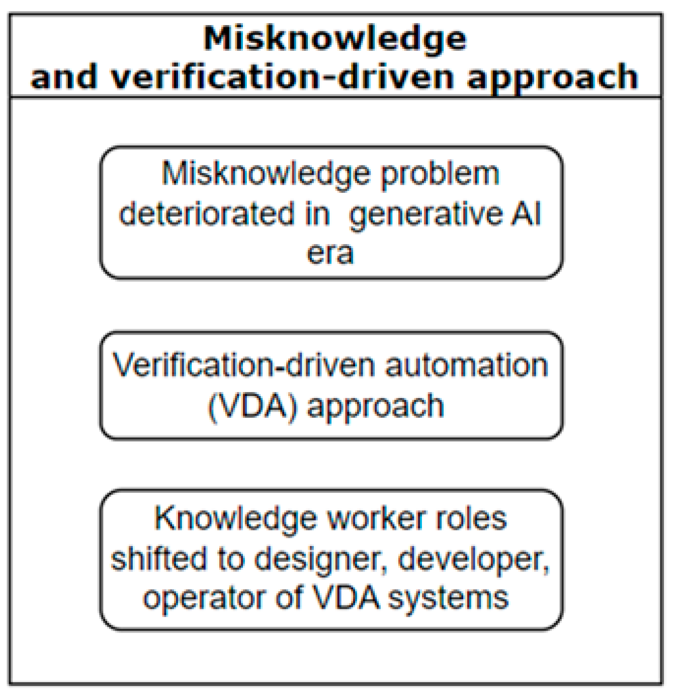 The authors also want to emphasize the danger of misknowledge during the generative AI adoptions. Misknowledge is a new phenomenon that is different from misinformation. Examples of misinformation damage include cyber-bullying [12] and the infamous “Fake News” problem on social media [13]. In the Internet era, the misinformation problem becomes far more damaging due to its rapid and widespread proliferation. Similarly, people will soon need to deal with the misknowledge problem in the generative AI era. The difference is that misknowledge can be more damaging and harder to detect. It will be harder to verify misknowledge than to verify misinformation [14]. Drawing on the Test-Driven Development (TDD) approach [15], this paper proposes a verification-driven approach in generative AI-aided knowledge work to safeguard the process and the results.