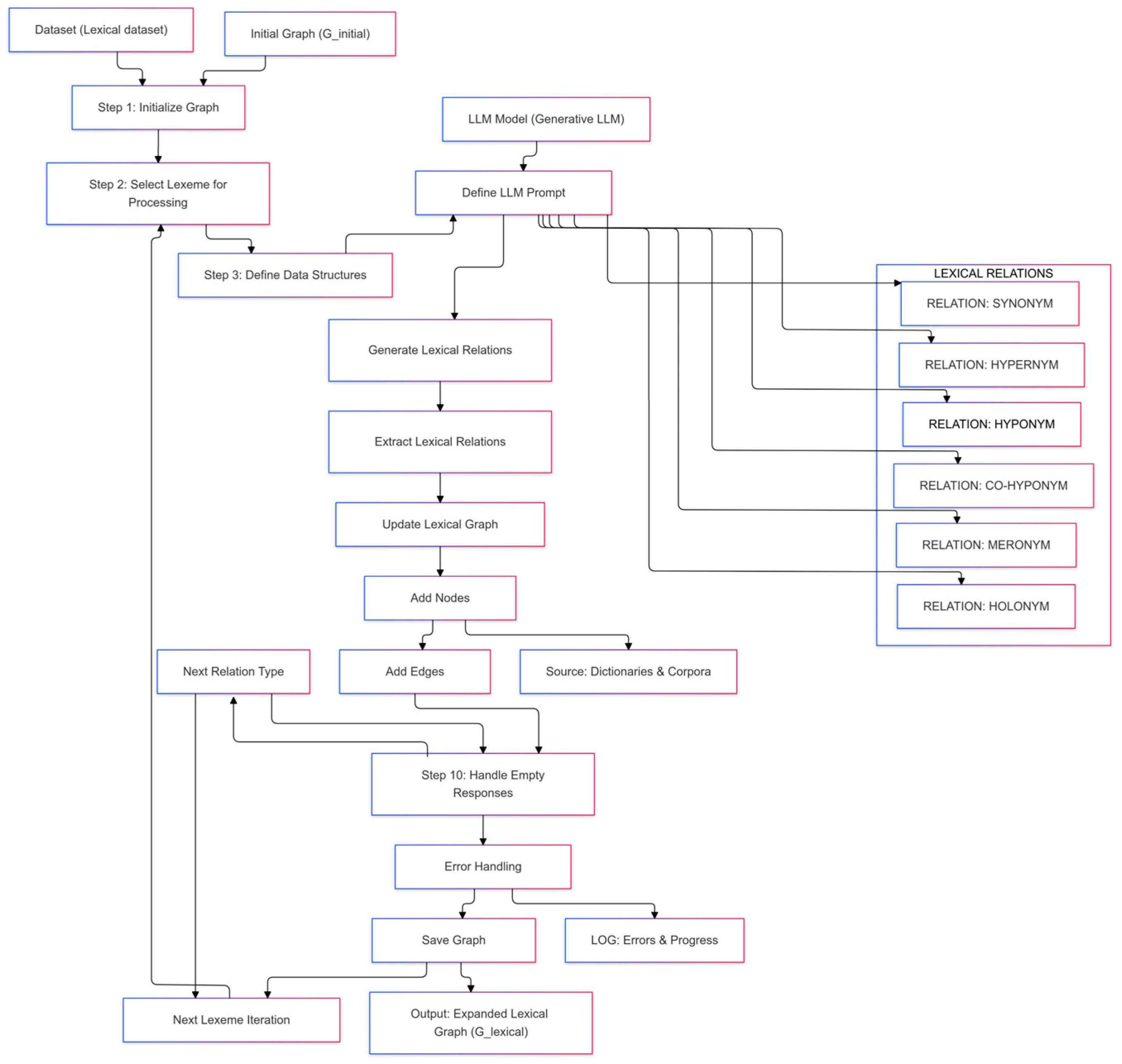 A structured prompt is then dynamically generated (Define LLM Prompt) for the current lexeme and relation type.