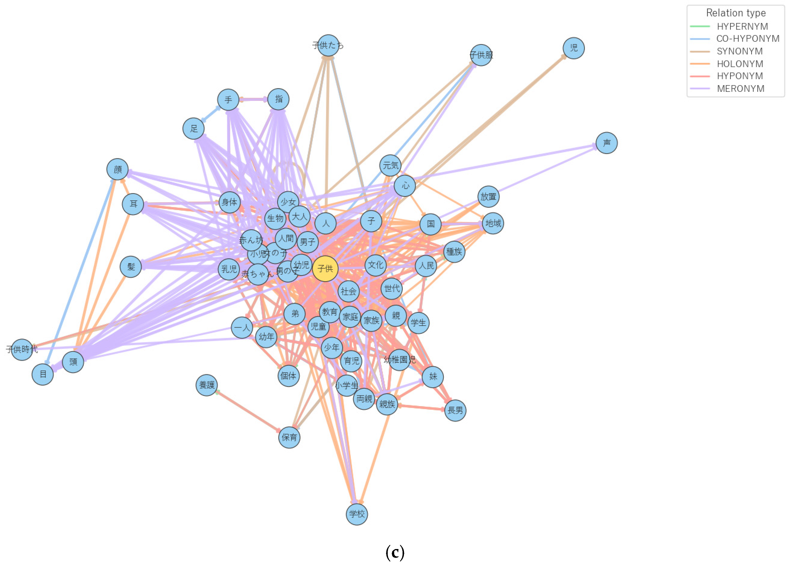 Figure 2a–c visualizes the actual subgraph of 1-hop relations centered on the Japanese lexeme 子供