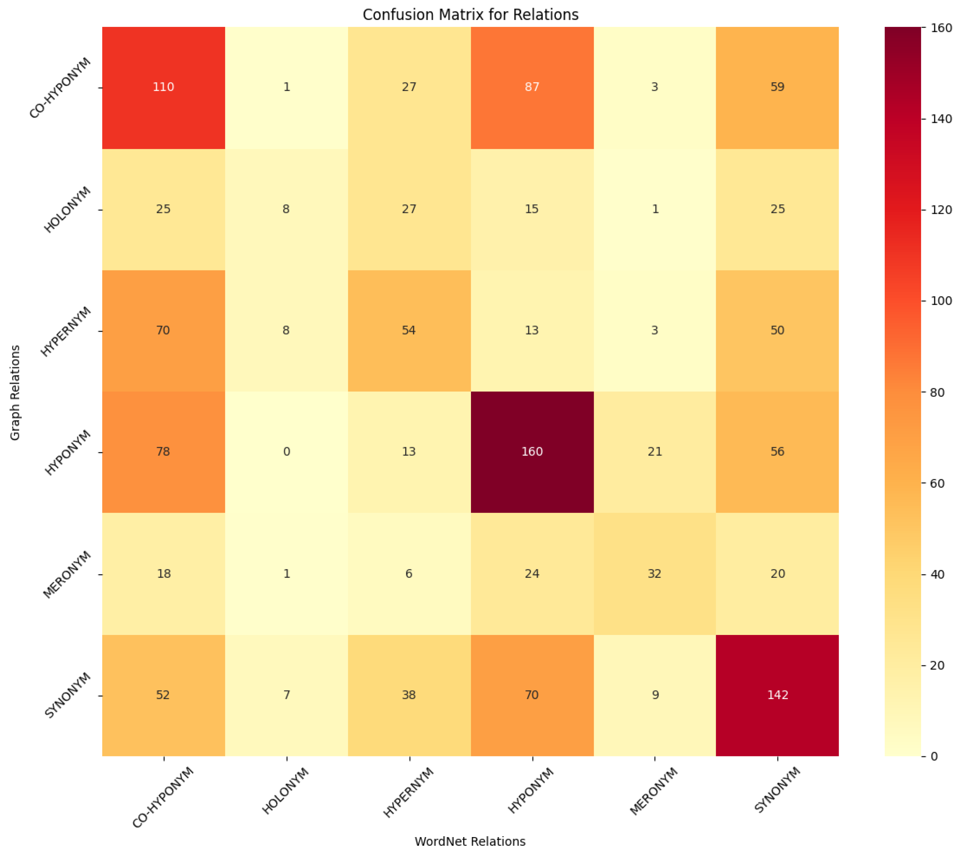 Figure 3) depicts the frequency distribution of relation types between the Graph and WordNet. The heatmap color scale highlights the intensity of matches, with deeper colors indicating higher counts of alignment. For each unique relation type, precision and recall metrics were calculated to assess the accuracy of the Graph-derived relations relative to WordNet. Precision represents the proportion of true positive relations (i.e., relations correctly matched between Graph and WordNet) out of all relations predicted by the graph as a specific type, while recall measures the proportion of true positives out of all actual instances of a specific relation type in WordNet.