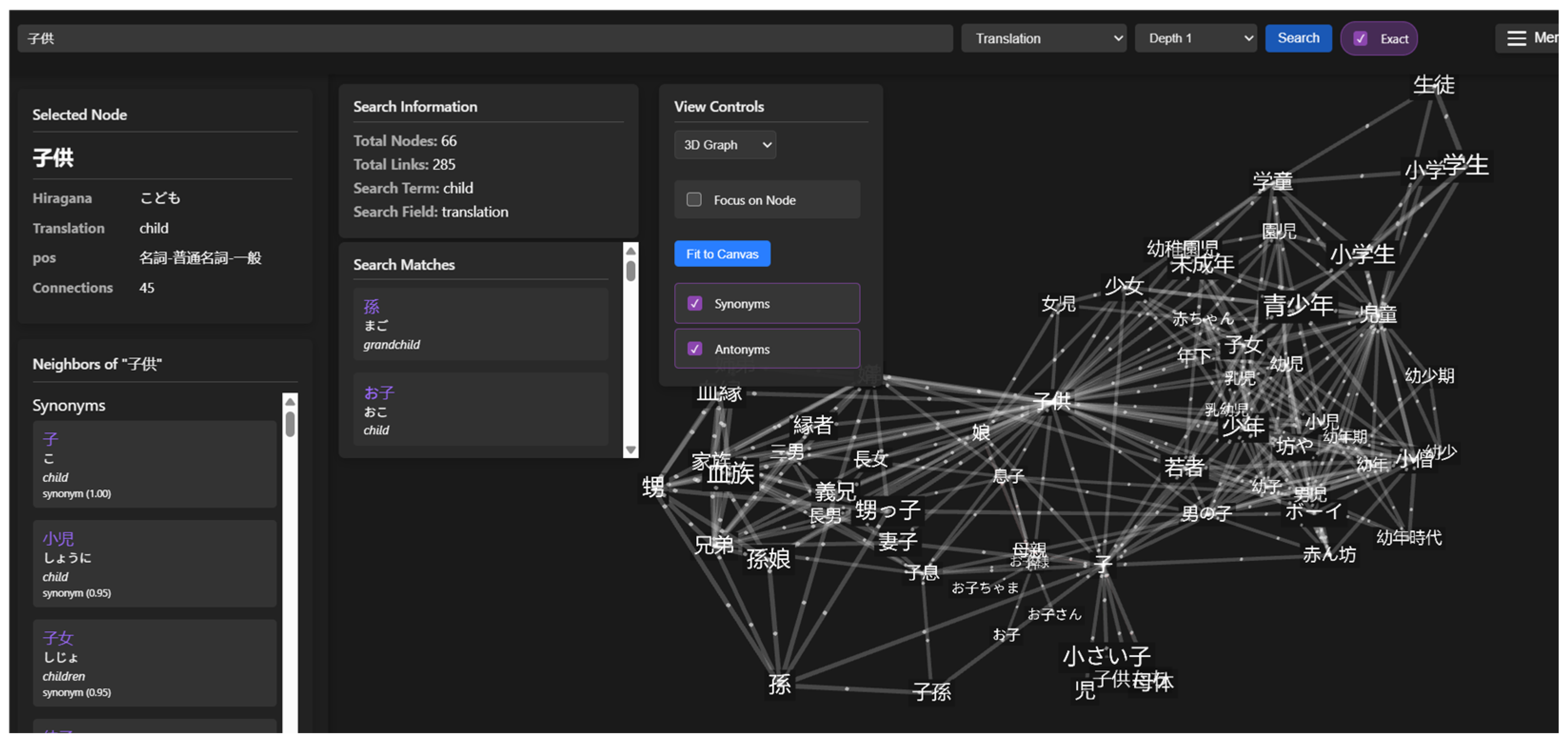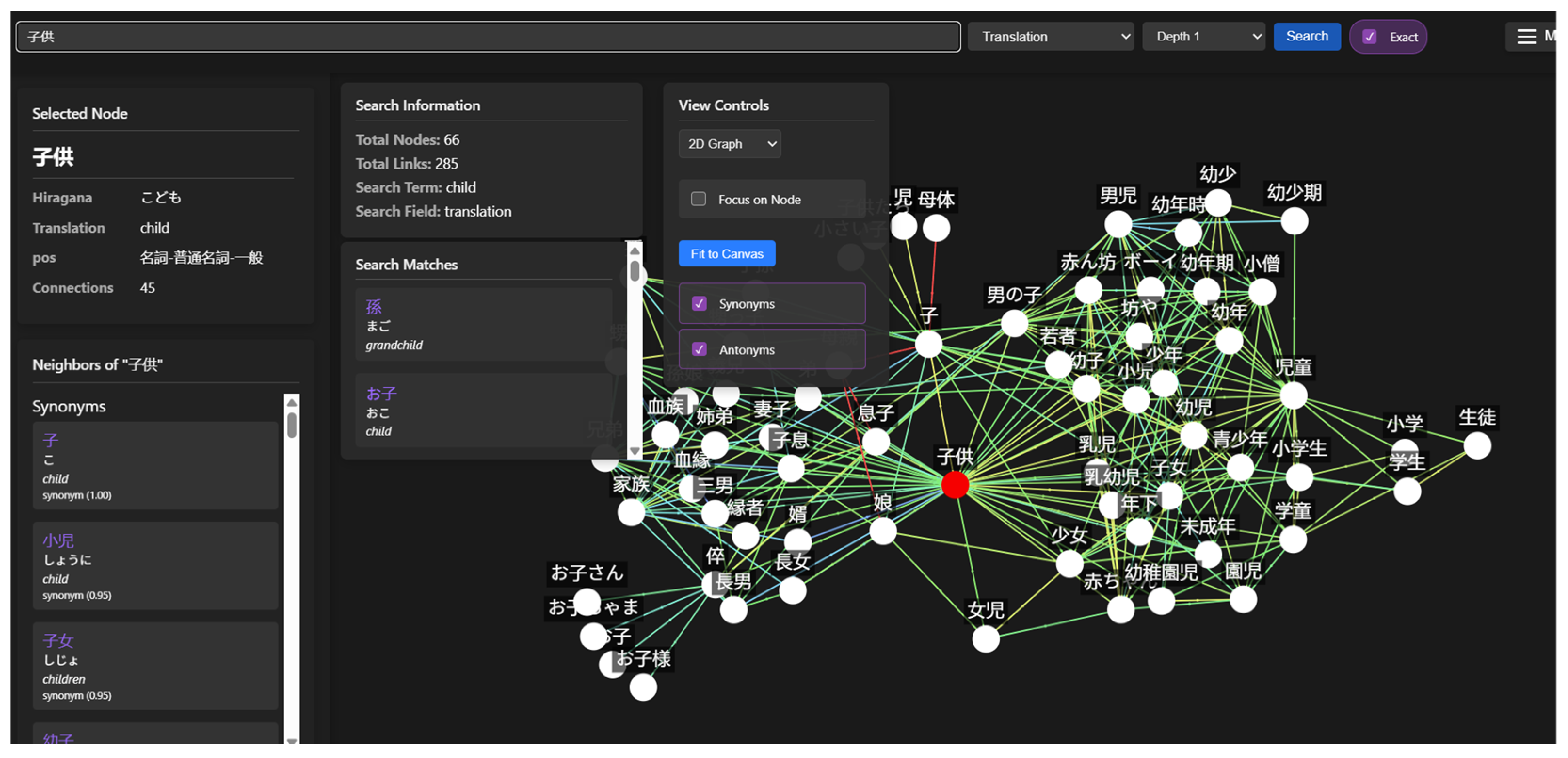 Figure 4, to explore and analyze the Japanese lexical network, with a particular focus on synonym relationships. We created an interface that allows users to interact with the synonym network through several key features, including search functionality, JLPT level filtering, relationship type selection, and graph depth control. These tools enable users to filter and navigate the network based on their specific requirements, providing an adaptable view of the network’s structure.
