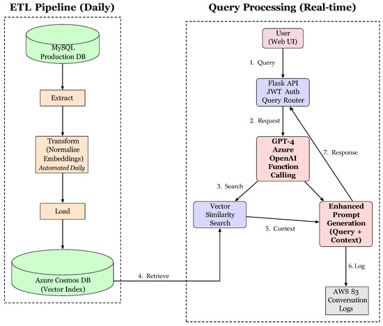 Our solution considers three key components: ETL, prompt engineering, and RAG. Figure 2 presents the proposed system’s architecture. The ETL pipeline extracts worker evaluations and relevant documentation from the MySQL database. Then, it transforms the content through normalization and embedding generation. Then, the content is loaded into Azure Cosmos DB with vector indexing, allowing it to be used in conversations. User queries flow from the user interface through the Flask API to GPT-4, which then uses function calling to retrieve relevant context through vector similarity search. The generated responses are logged and returned to users through the web interface.