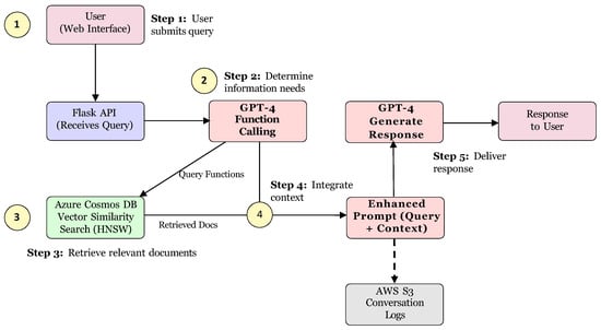 The final step uses GPT-4 to generate the response. The response is then delivered to the user via the Flask API to the web interface for display purposes. We note that the generated response is logged into AWS S3 to track conversation history tracking for audit purposes.