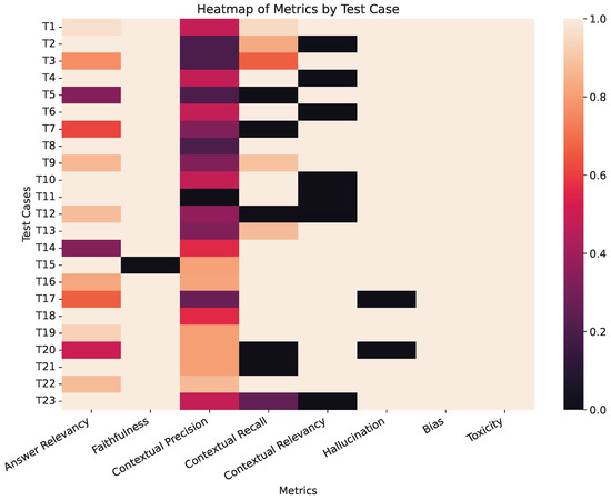 We now present the results of the RAG evaluation metrics. First, contextual precision presents the most challenges, as only 6 of 23 cases (26%) achieving High scores. The distribution shows 5 Low, 10 Medium-Low, and 2 Medium-High scores, which shows that the retrieval mechanism frequently retrieves relevant information but does not always rank the information optimally. Contextual recall performs better, with 16 of 23 cases (70%) achieving High scores, although 6 cases scored Low. These results suggest that the system can generally retrieves the necessary information, but will occasionally miss relevant documents. Contextual relevancy scored high in 16 test cases (70%) but failed in 7 instances (30%), indicating that retrieval sometimes identified tangentially related rather than directly applicable information. In the T20 and T21 cases, the contextual precision was lower than in the other cases (i.e., the retrieval context lacked the specific information required to answer). Comparing expected and actual responses for these cases revealed that the language model tends to generate more extensive responses. Furthermore, in the case of T20, this led the system to attempt to generate answers that hallucinated the missing data.