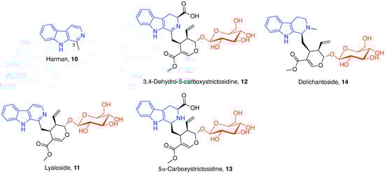 - Kitajima, M.; Yokoya, M.; Takayama, H.; Aimi, N. Co-occurrence of Harman and β-Carboline-type Monoterpenoid Glucoindole Alkaloids in Una de Gato (Uncaria tomentosa). Nat. Med. 2001, 55, 308–310. [Google Scholar]