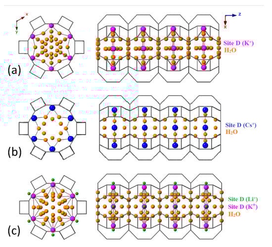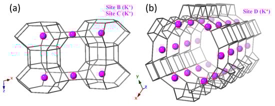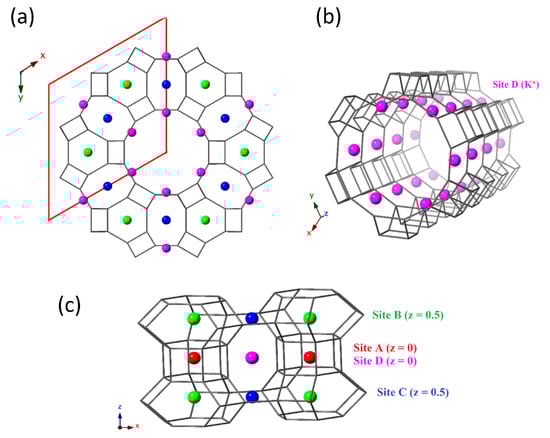 The 12R, 1D channel of the LTL framework is orientated along the crystallographic c-axis, enclosed by vertical stacks of alternating cancrinite cages (can) and double-6 ring units (d6rs), with smaller, elliptical 8R channels alternating between these columns, Figure 1. K cations have previously been shown to reside at four distinct cation sites, labelled A–D in Figure 2 [,,]. Site A is located at the centre of the d6r units (z = 0), site B at the centre of the can cages (z = 1/2), site C in the window between the elliptical 8R channels and walls of the 12R channel (z = 1/2) and site D at the periphery of the 12R channel (z = 0).