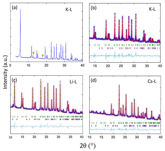 Figure 3 shows powder X-ray diffraction data and associated Rietveld refinement profiles for K-L and partially exchanged Li-L and Cs-L at ambient pressure. Crystal structures and cell parameters for all refined samples are given in the Appendix A Table A1, Table A2, Table A3, Table A4, Table A5, Table A6.