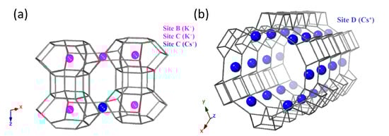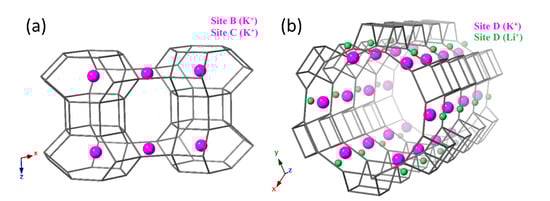 Figure 5 shows the refined, partially exchanged Cs-L structure. Site D undergoes a complete exchange of 0.63 K ions per unit-cell and is repopulated by 0.72 Cs ions per unit-cell. In comparison to the parent K-L structure (Figure 4), Cs ions located at site D are inset further into the 12R channels so that stability is achieved by accommodating their higher steric demands. Cs ions can, therefore, be considered stable at site D and a 100% exchange rate proves that this is an open site. Refined occupancies reveal that site C is partially occupied by 0.45 and 0.38 K or Cs ions, respectively. Refinement models with K solely populating site C result in occupancies > 1 and this excess electron density indicates the presence of Cs. Site C is, in fact, not a closed site, as previously suggested by Newell and Rees, and can exchange K ions with Cs ions []. Our refinement models show that site C is susceptible to exchange with Cs ions and is similarly populated to its gallosilicate analogue, reported by Seoung et al., to have a 50:50 fractional occupancy at this same site []. It is also important to note that the overall occupancy at site C by K and Cs ions combined is 0.83 per unit cell compared to the full occupancy by K ions in the parent K-L zeolite. To render an overall neutral structure, this is compensated for by the increased overall occupancy at site D which is 0.72 Cs per unit-cell compared to the 0.63 K in the parent K-L zeolite. This emphasises that Cs ions preferentially occupy site D over site C as the free volume available is greater here to accommodate larger Cs cations. Exchange of the parent K-L zeolite with Li ions leads to a partially exchanged Li-L zeolite. Again, site B is inert to exchange and remains fully occupied by K ions. Interestingly, unlike with Cs ion exchange, site C is also locked and remains fully populated by K ions. Only site D is shown to be susceptible to Li exchange and our refinement models show it to be partially occupied by 0.11 and 0.57 Li and K ions, respectively. Refinement models with only K ions at site D again show excess electron density, separate to that associated with the K ions, and this identifies as Li ions that sit further towards the periphery of the 12R channel.