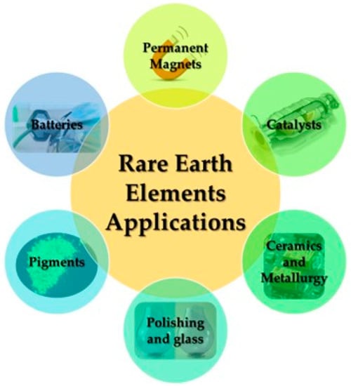 The REEs exhibit exceptional physical properties, which have made them necessary in the development of high-tech applications, such as smartphones, digital cameras, computer hard disks, fluorescent and light-emitting-diode (LED) lights, flat-screen televisions, computer monitors, and electronic displays. For example, the permanent neodymium-iron-boron magnets are essential for elaborating the electrification of vehicles and wind energy. In addition, portable electronic devices, such as computers and mobile phones, consist of NiMH batteries containing REEs (La, Pr, and Ce) [4,5,6,7].